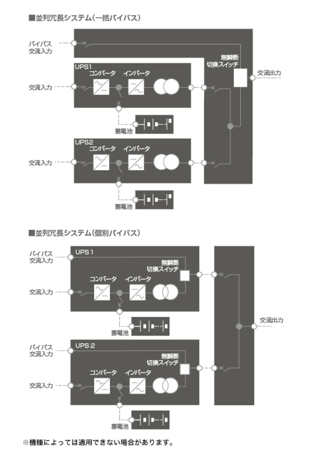 負荷機器の重要性に応じて、単機システム、単機保守バイパス付システム、並列冗長システム、直列冗長(常用予備/待機冗長)システムなどさまざまな構成ができます。
